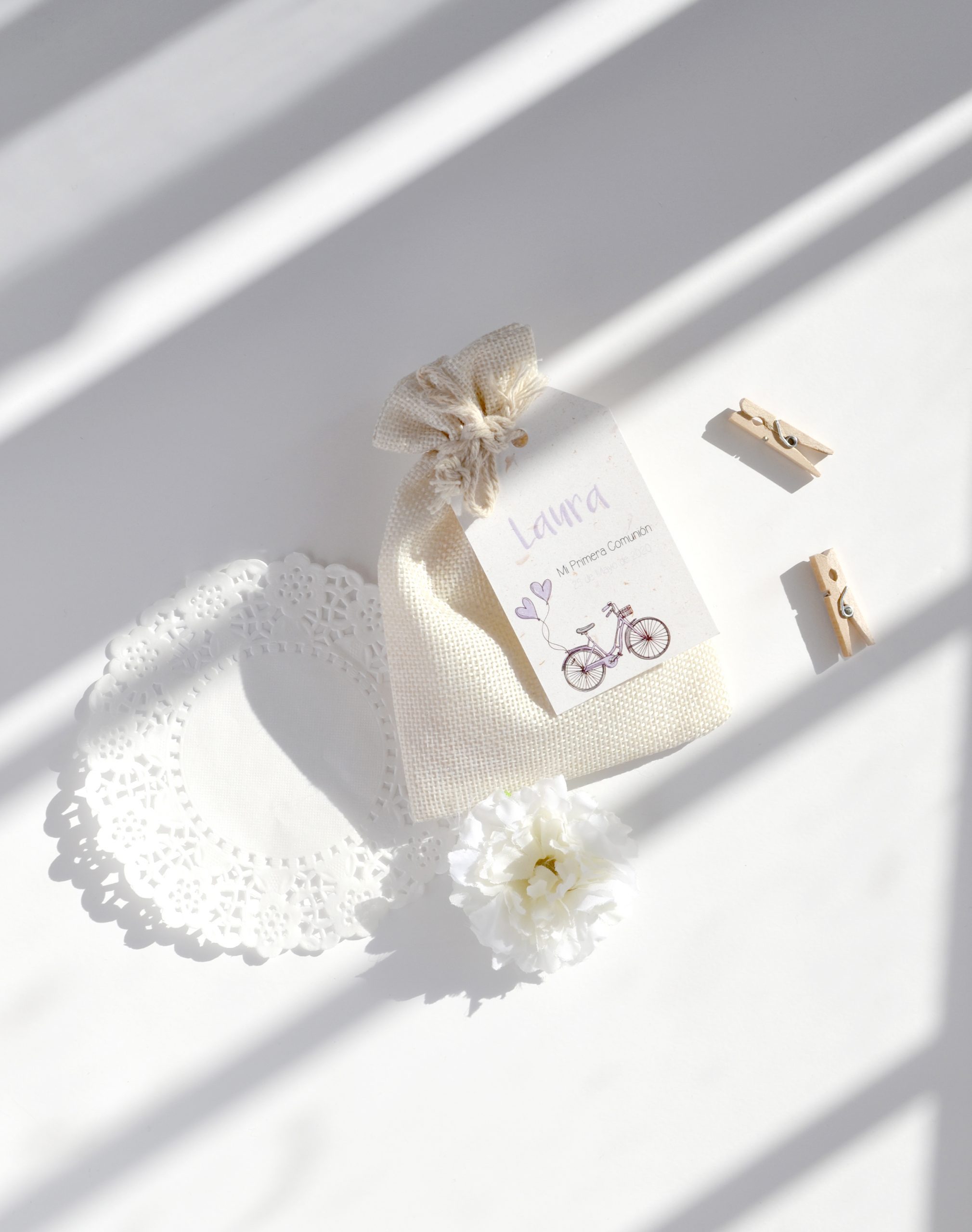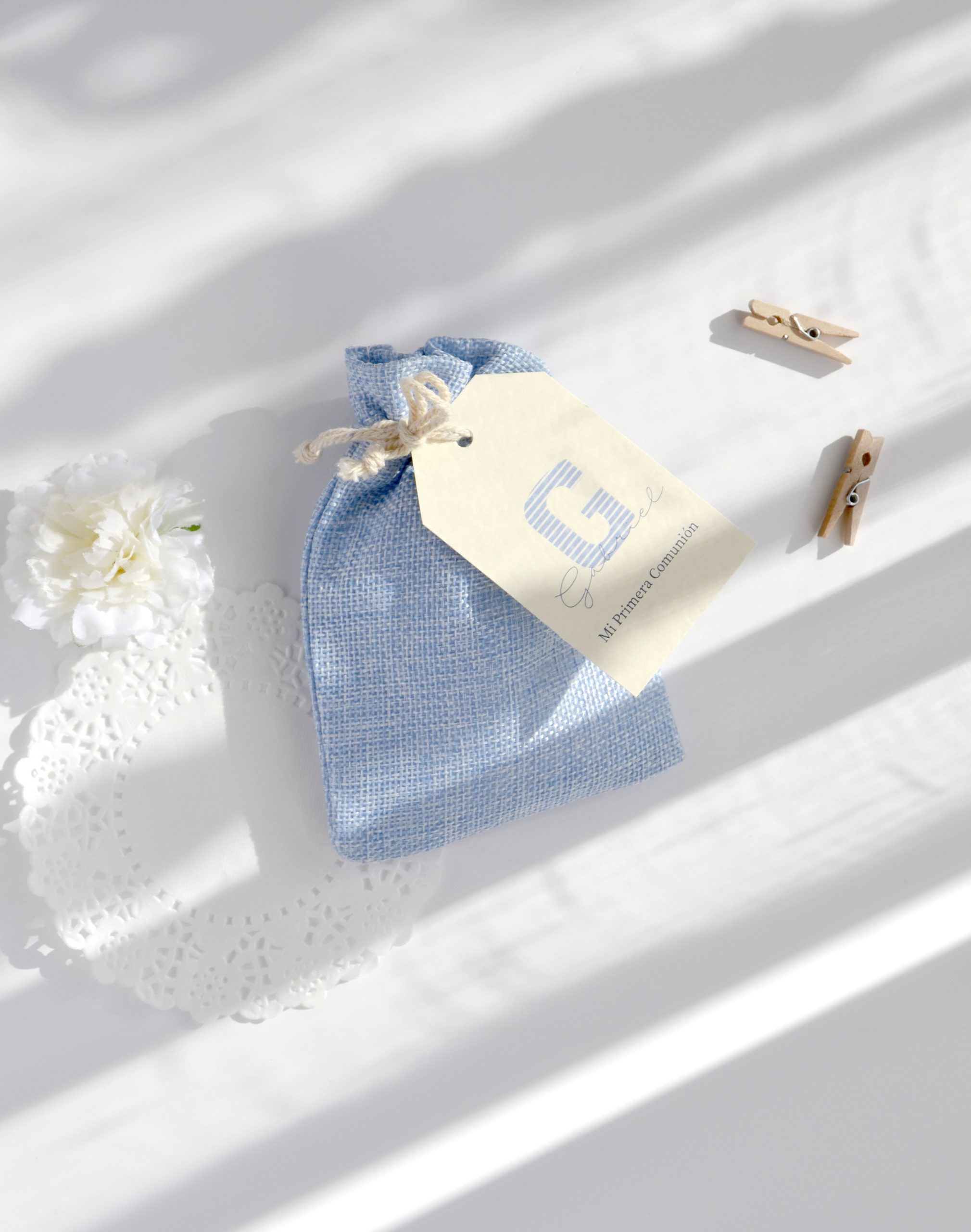 Saquito para guardar regalos. Combínalo con nuestra etiqueta con forma para comuniones.