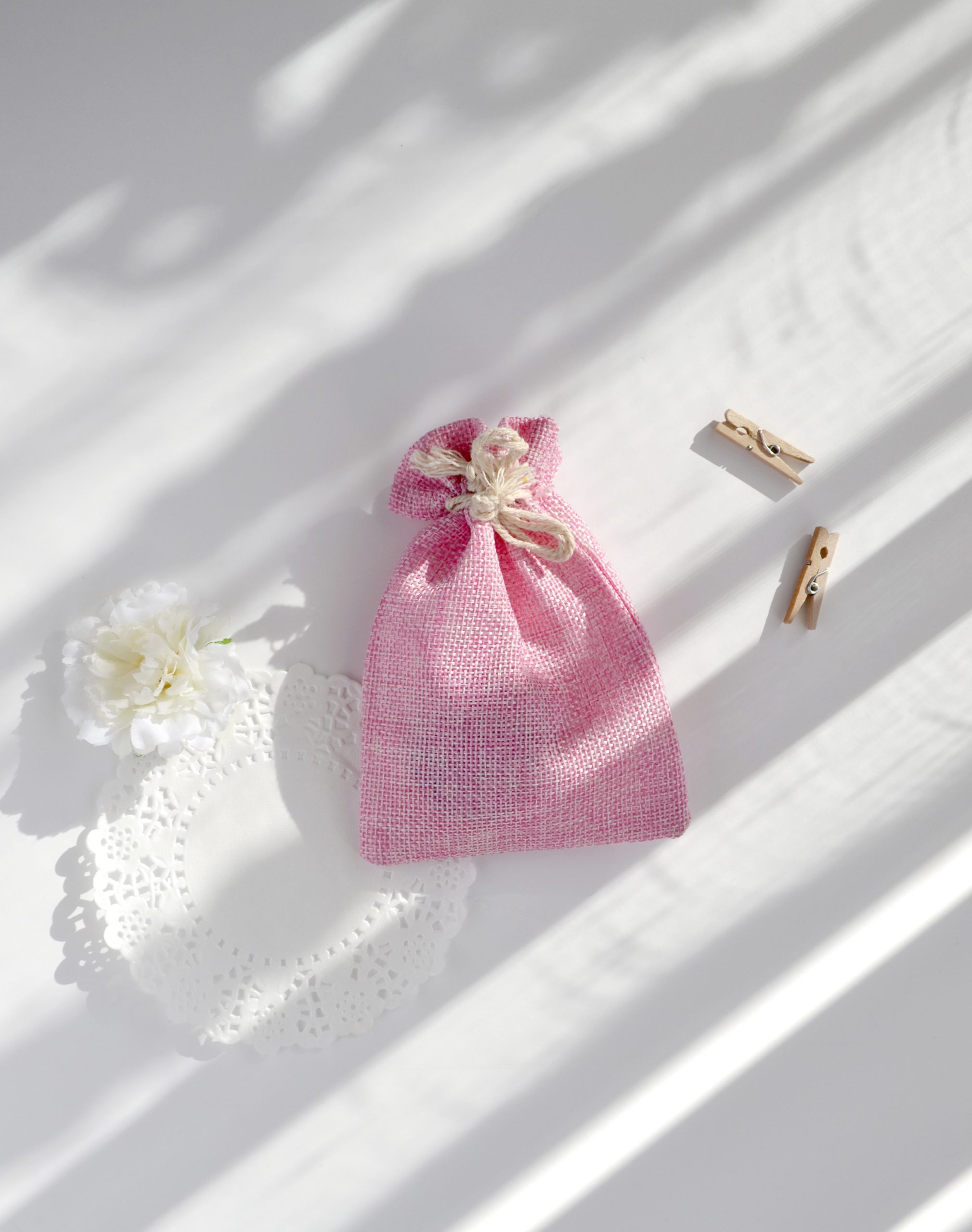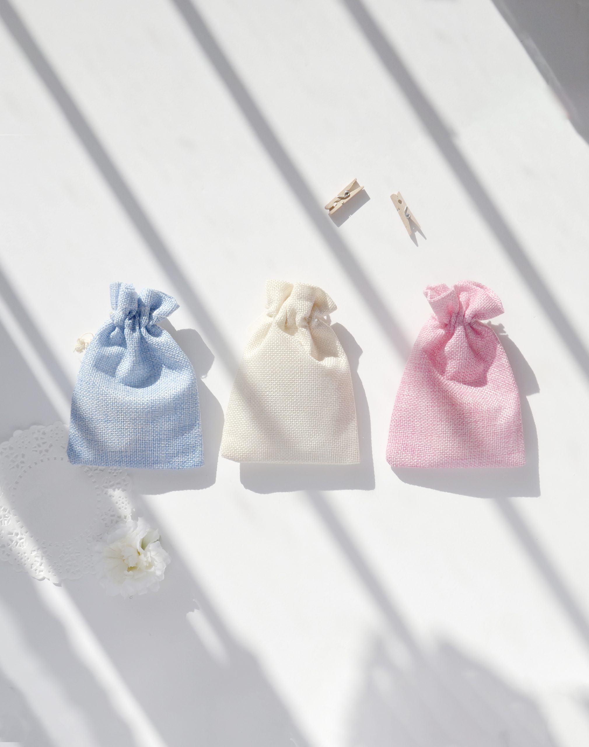 Saquito para guardar los regalos de comunión para tus invitados. Tamaño de 10 cm de ancho por 12 cm de alto aproximadamente. Disponible en tres colores: rosa, azul y blanco.
