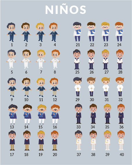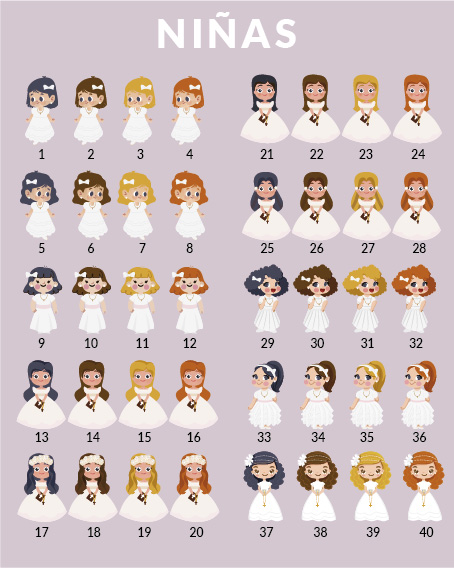 En muchos de nuestros modelos de invitación de comunión puedes añadir un personaje personalizándole con las características de tu hij@.  Sólo tienes que elegir el modelo de niño o niña que más se parezca a tu hij@, observando su color de pelo y ojos, y su vestuario y nosotros lo añadiremos a la invitación dándole el protagonismo que merece. En otros modelos sólo es posible personalizar la invitación con los datos de fecha, nombre, lugar…