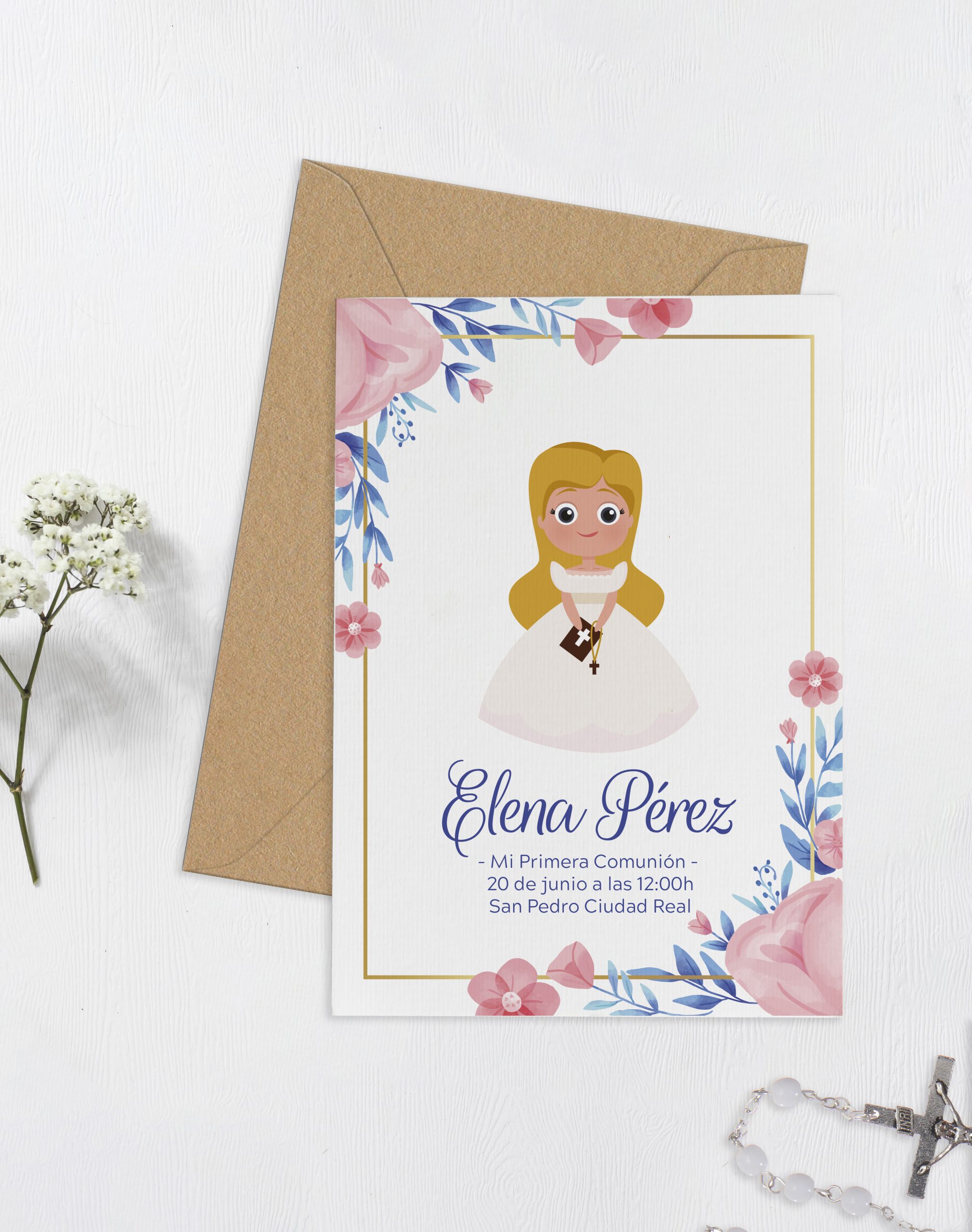Invitación de comunión personalizada. Decide en qué papel quieres que imprimamos tu invitación y personalízala con los datos de tu peque.