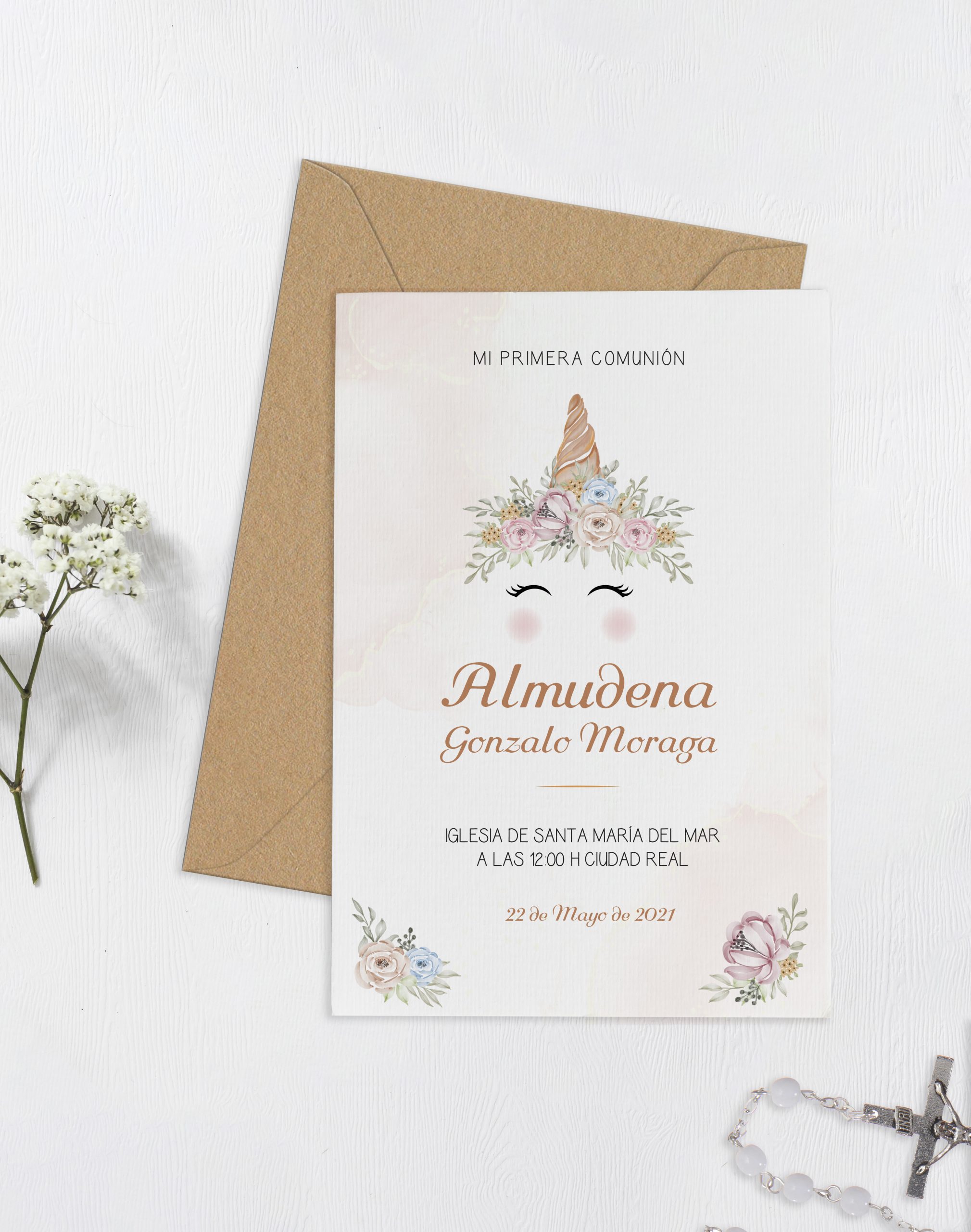 Invitación de comunión personalizada. Decide en qué papel quieres que imprimamos tu invitación y personalízala con los datos de tu peque.