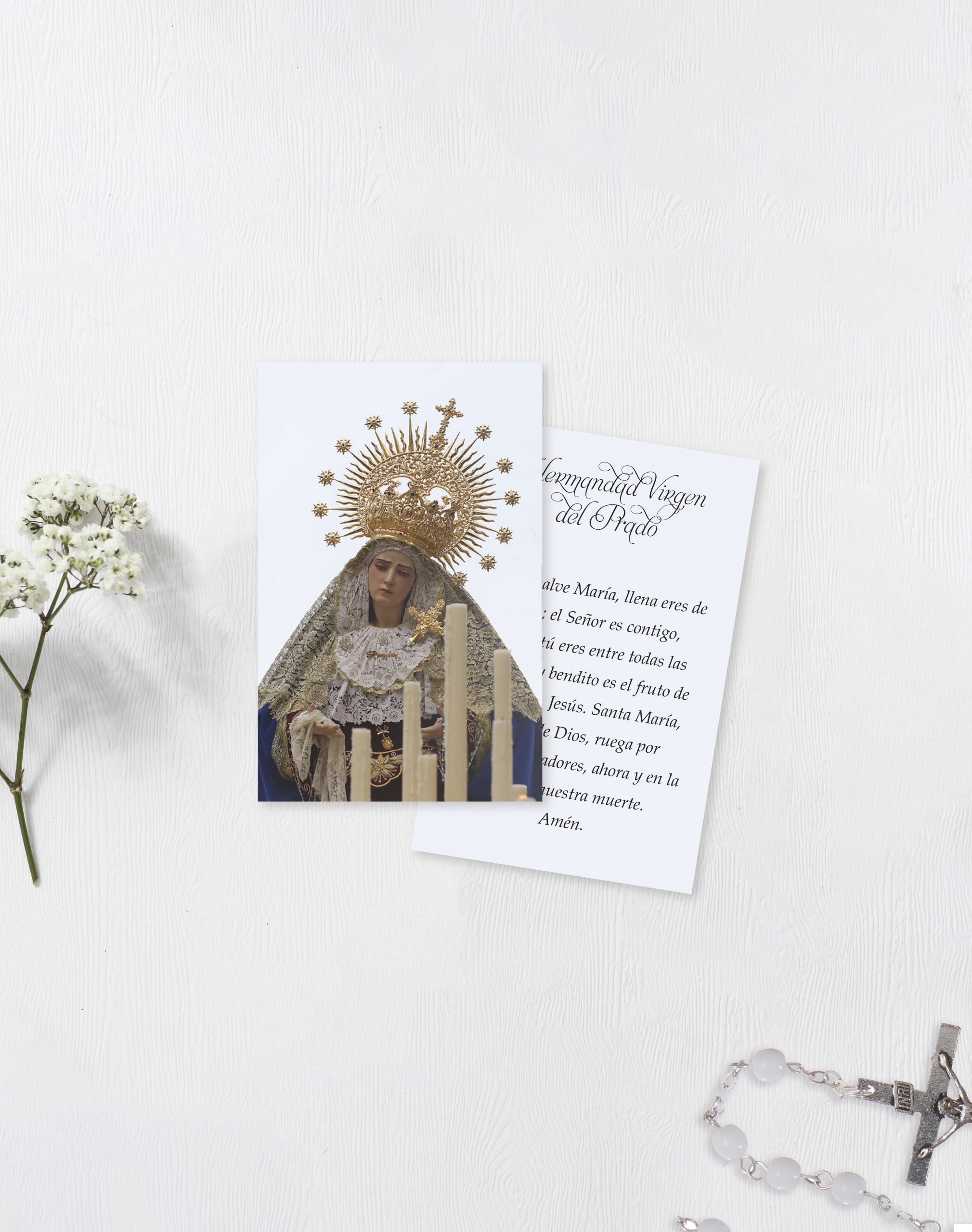 Estampa religiosa personalizada. Impresa en papel estucado de 300 gr a doble cara y a todo color. Precios especiales para grandes cantidades pensados para Hermandades y peñas. Sube la imagen que quieras que aparezca en la parte delantera de la trasera, y elige qué quieres en la trasera: puedes poner una imagen o un texto.